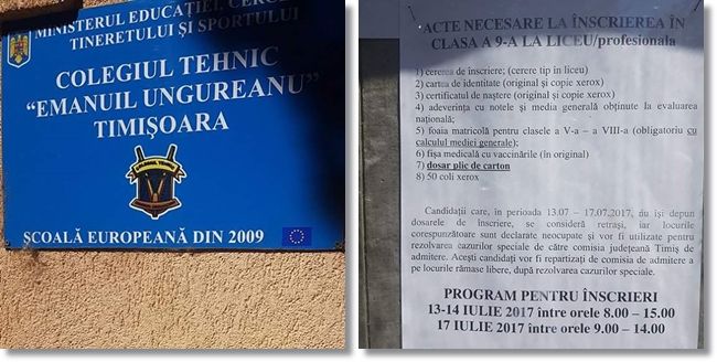 Poate vi se pare ciudat sau „de demult”, dar așa „sună” cerințele reprezentanților unui liceu din Timișoara pentru elevii care vor să se înscrie în clasa a IX-a. Tragem cortina... timpului și vă dezvăluim că este vorba despre Colegiul Tehnic „Emanuil Ungureanu” din urbea de pe Bega. Știm... Să aduci 50 de coli la școală, la înscriere, parcă e din alte vremuri. Dar e adevărat...