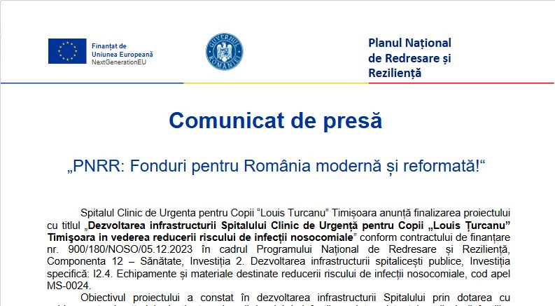 Spitalul Clinic de Urgenta pentru Copii “Louis Turcanu” Timișoara anunță finalizarea proiectului cu titlul „Dezvoltarea infrastructurii Spitalului Clinic de Urgență pentru Copii „Louis Țurcanu” Timişoara in vederea reducerii riscului de infecții nosocomiale” conform contractului de finanțare nr. 900/180/NOSO/05.12.2023 în cadrul Programului Național de Redresare și Reziliență, Componenta 12 – Sănătate, Investiția 2. Dezvoltarea infrastructurii spitalicești publice, Investiția specifică: I2.4. Echipamente și materiale destinate reducerii riscului de infecții nosocomiale, cod apel MS-0024.