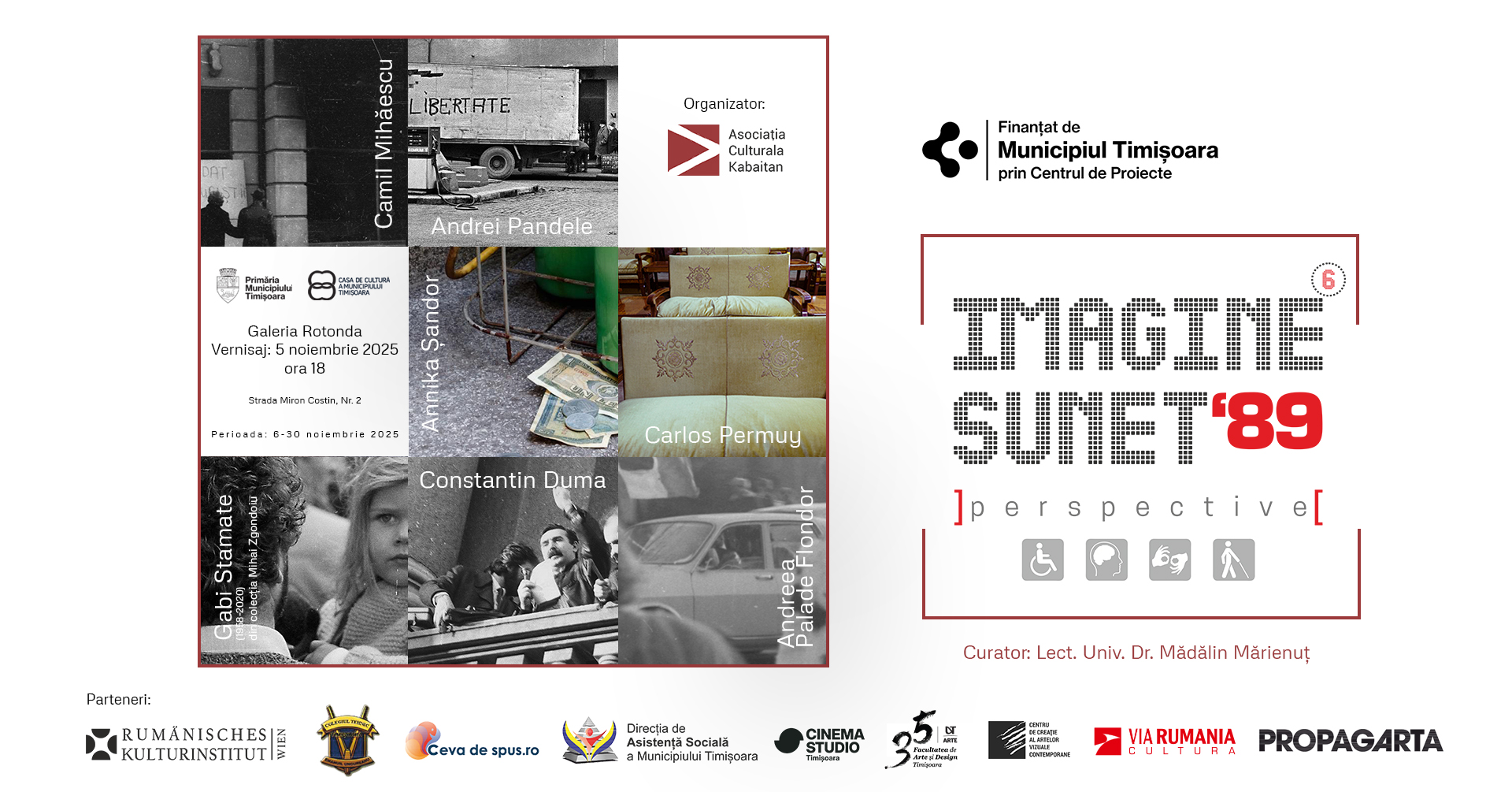O nouă expoziție de fotografie despre Revoluția din 1989 prin lentila artei contemporane va fi vernisată miercuri, 5 noiembrie, de la ora 18, la Galeria Rotonda a Casei de Cultură a Municipiului Timișoara. Evenimentul face parte din proiectul cultural „IMAGINE. SUNET. ’89. Ediția a șasea: Perspective”, organizat de Asociația Culturală Kabaitan.