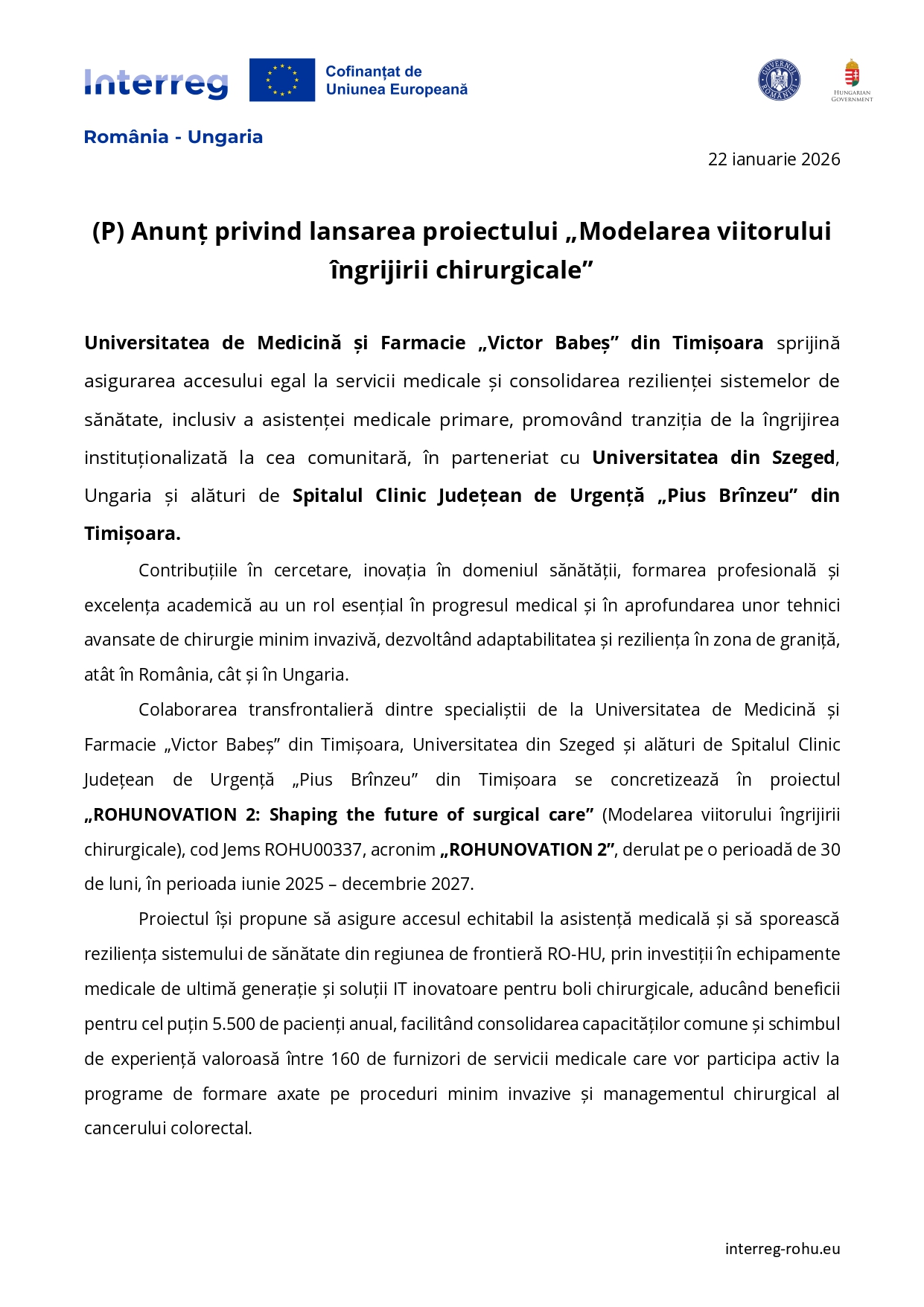 (P) Anunț privind lansarea proiectului „Modelarea viitorului îngrijirii chirurgicale”