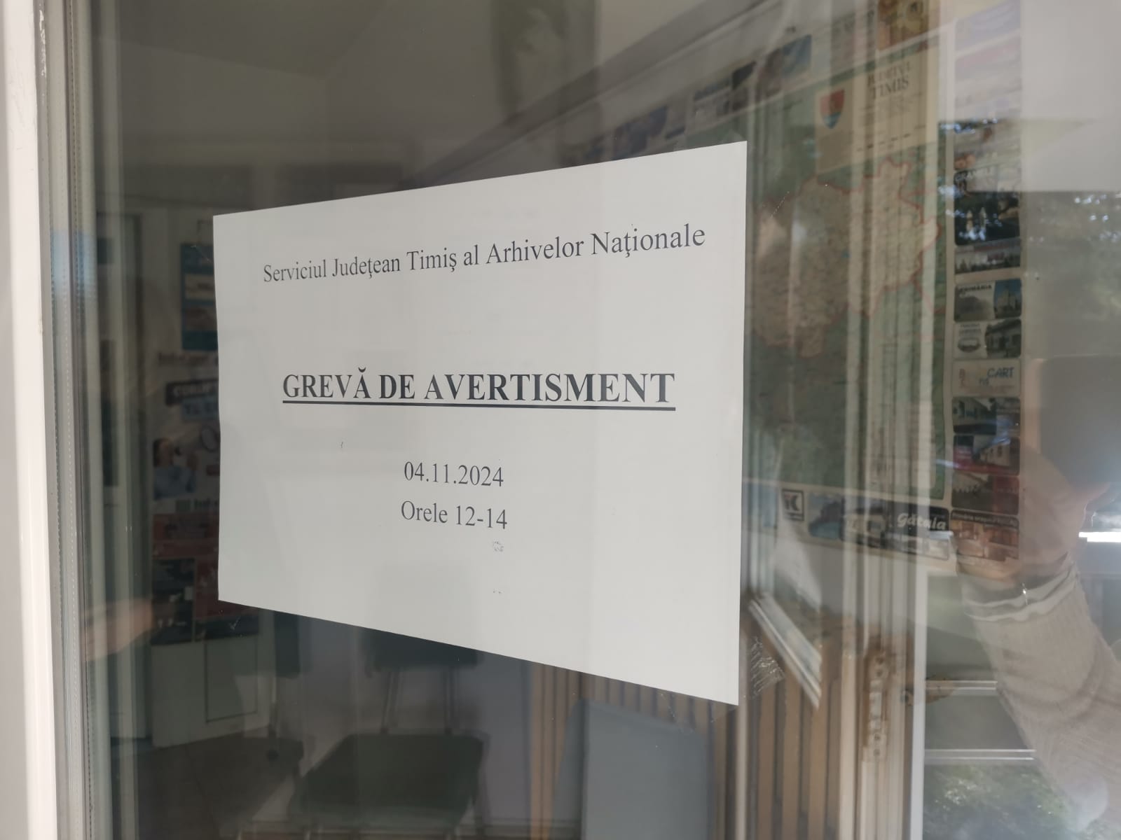 Angajații Arhivelor Naţionale ale României organizează luni, 4 noiembrie, între orele 12 și 14, o grevă de avertisment. Vor participa inclusiv angajați ai Serviciului Județean Timiș. Aceasta ar fi prima acțiune de acest fel din istoria de 192 de ani a instituției. Principalul motiv este „discriminarea salarială”, fapt care duce și la o lipsă permanentă de personal.