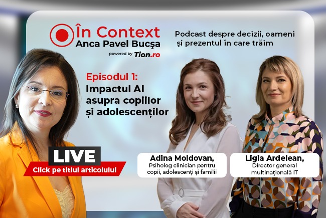 Urmăriți LIVE primul episod „În Context” cu Anca Pavel Bucșa: „Impactul AI asupra copiilor și adolescenților”.  Invitați:  Ligia Ardelean, director general companie IT și Adina Moldovan, psiholog clinician pentru copii, adolescenți și familii