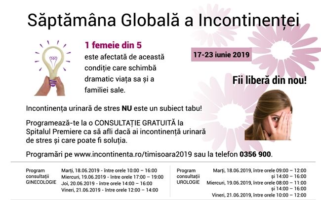 ADVERTORIAL. Incontinența urinară este o problemă medicală serioasă, cu multiple efecte asupra vieții pacientelor și familiilor lor. Din nefericire este un subiect greu de abordat, doar 40% dintre acestea având curajul de a discuta despre această condiție cu un specialist. Pentru a atrage atenția asupra acestei afecțiuni comune (căci incontinența afectează 1 din 5 femei) și pentru a încuraja toate potențialele paciente să discute deschis despre această afecțiune, specialiștii au celebrat în săptămâna 17-23 iunie „Săptămâna Globală a Incontinenței”.