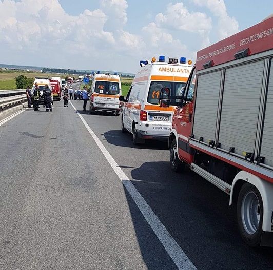 Accident inexplicabil în Timiș. Un bărbat care circula dinspre Timișoara spre Lugoj a pătruns pe contrasens, chiar pe pasajul de la Remetea Mare și s-a izbit frontal de o ambulanță care se afla în misiune. Șapte persoane au fost rănite și transportate la spital, iar circulația în zonă a fost blocată până când poliția va finaliza cercetările la fața locului.