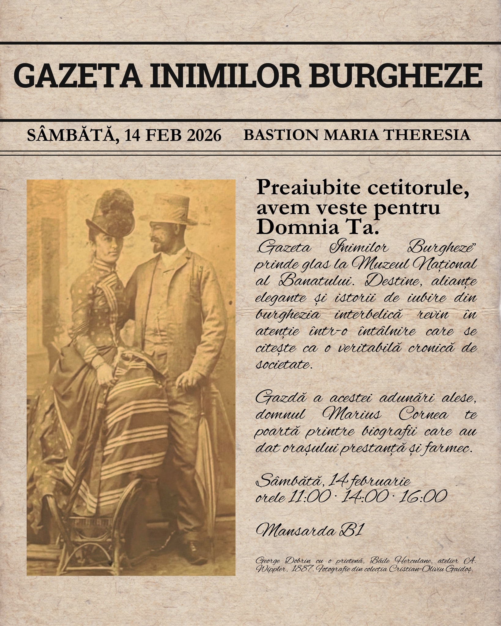 Timișoara își redeschide porțile către istoria sa romantică și mondenă. Muzeul Național al Banatului invită publicul să descopere o nouă ediție din „Gazeta Inimilor Burgheze”, care pune în lumină povești de dragoste și alianțe sociale din burghezia timișoreană.