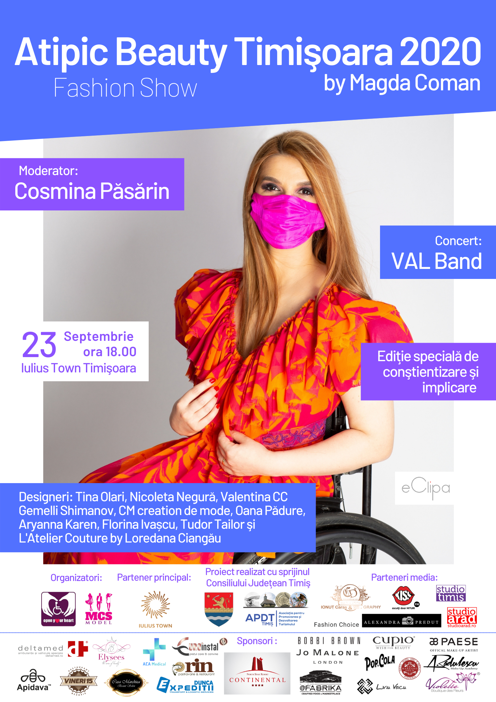 Timișoara, 22 septembrie 2020: Emoția și glamourul își dau întâlnire la evenimentul Atipic Beauty din Iulius Town. 12 modele în fotoliu rulant, alături de personalități locale din Timişoara, vor participa la o prezentare de modă inedită. Defilarea este o pledoarie despre oameni cu motivații puternice, curaj, ambiție, solidaritate și conștientizare.