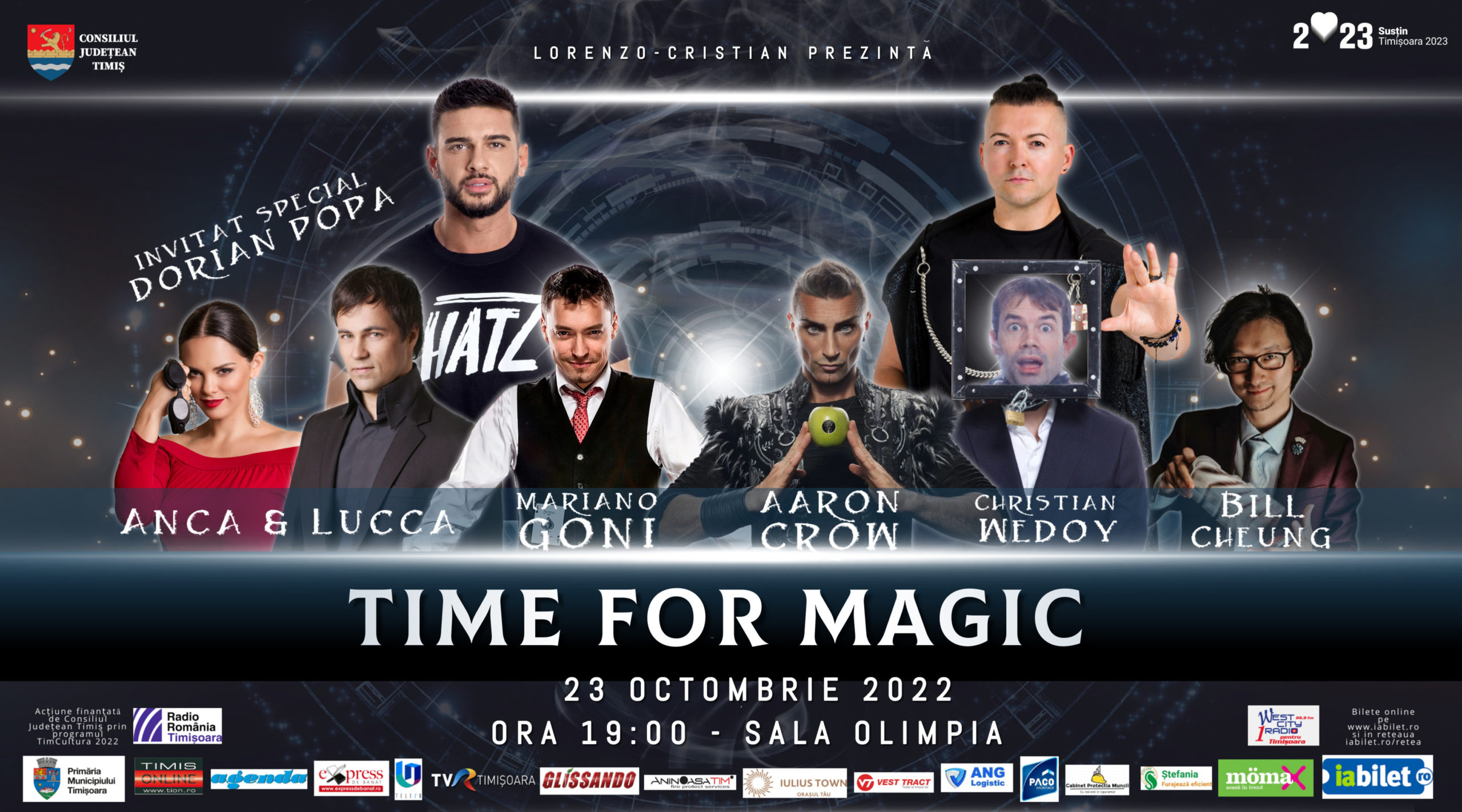 Sâmbătă, 22 octombrie, se dă startul festivalului TIME FOR MAGIC. Publicul este așteptat la Iulius Town, la un show surpriză de lansare a primului festival internațional de magie care a avut loc vreodată la Timișoara. Dorian Popa le-a pregătit o surpriză participanților: va levita cu ajutorul fantasticului Lorenzo-Cristian!
