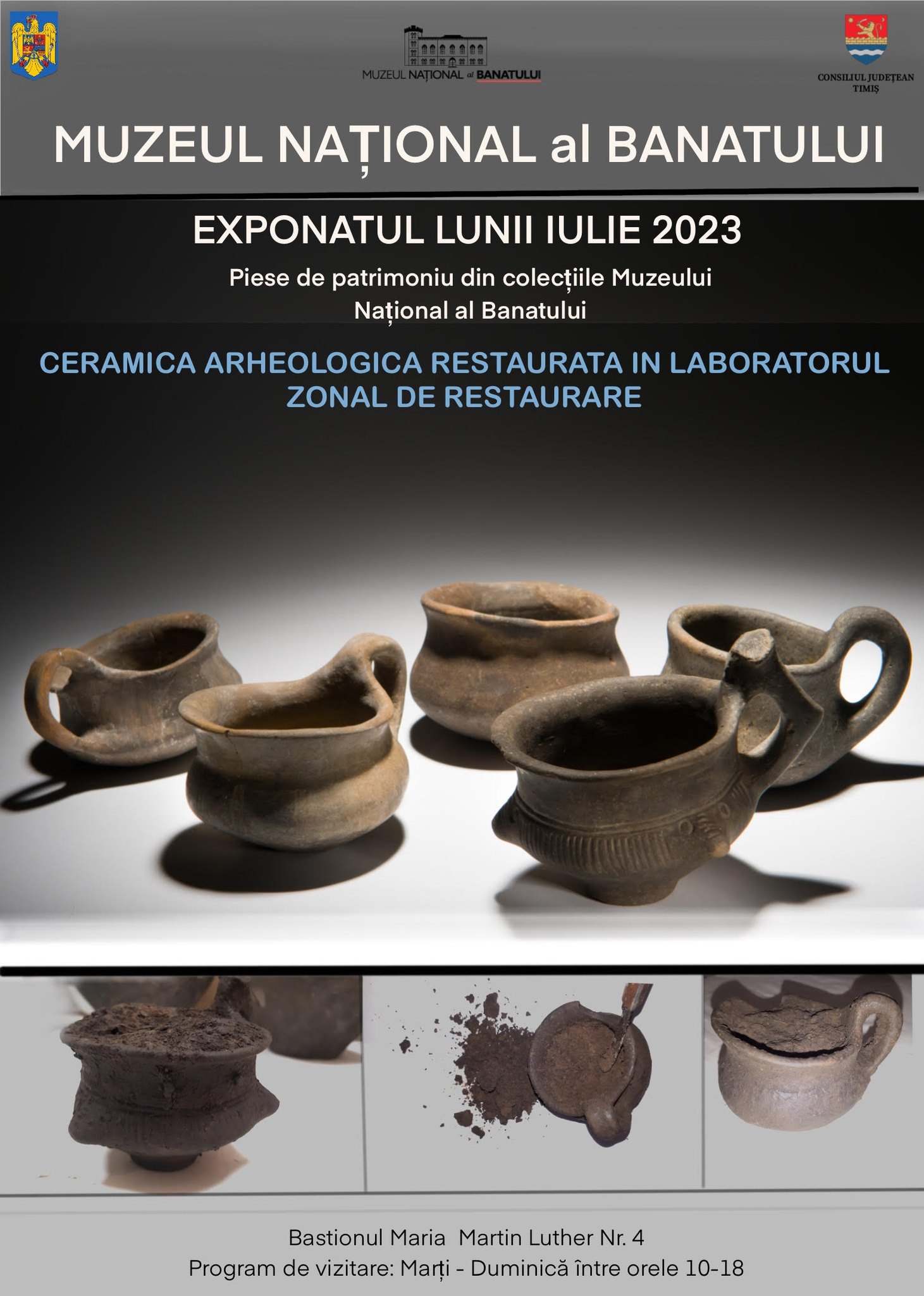 Ceramică Arheologică Restaurată în Laboratorul Zonal de Restaurare reprezintă exponatul lunii iulie la Muzeul Național al Banatului. Conform reprezentanților instituției, cănițele sunt mai mult decât niște obiecte vechi. Sunt povești în sine, sunt ecouri ale unui timp uitat, sunt conexiuni cu strămoșii noștri.