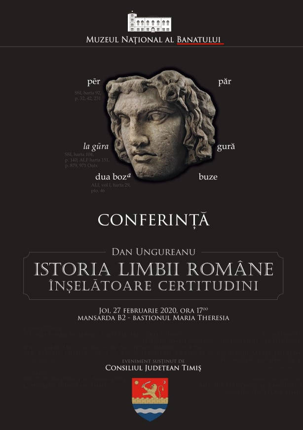 Evenimentul „Istoria limbii române – înșelătoare certitudini” va avea loc la Muzeul Național al Banatului, în incinta Bastionului Theresia. Este prima dintre ineditele evenimente din proiectul ”Conferințele mansardei theresiene”. Este un proiect inițiat de reprezentanții secției de arheologie a muzeului, care va avea loc lunar în mansarda Bastionului Maria Theresia.