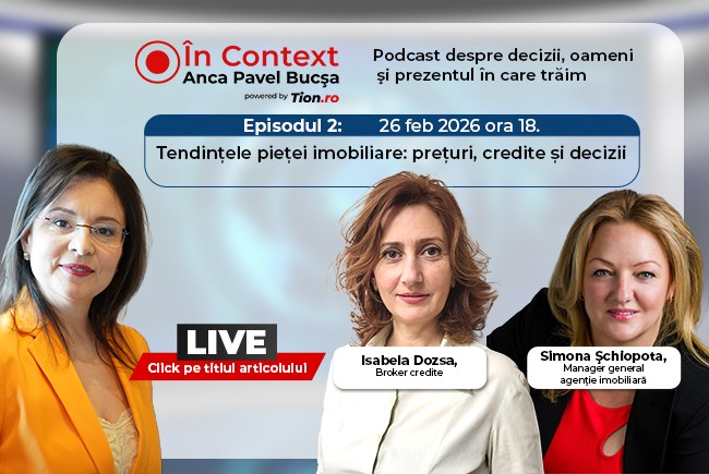 Urmăriți LIVE al doilea episod „În Context” cu Anca Pavel Bucșa: „Tendințele pieței imobiliare”, astăzi, de la ora 18! Invitate: Simona Șchiopotă, manager general Agenție imobiliară, și Isabela Dozsa, broker credite.