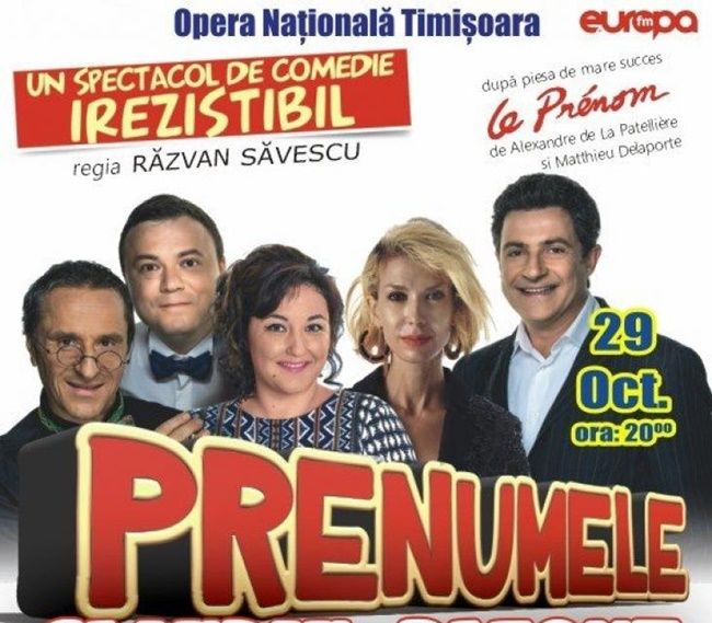 „Prenumele” este comedia franceză, regizată de Răzvan Săvescu, care-i va readuce la Opera Națională Română Timișoara pe actorii Claudiu Bleonț, Mihai Călin, Alina Chivulescu (Bella din serialul „La bloc “), Ecaterina Ladin (Dalida din serialul „Las fierbinți”) și Leonid Doni (polițistul Robi din același sitcom) într- o dezbatere savuroasă, de un umor irezistibil. Tion.ro nu vrea să ratezi această piesă minunată și pune la bătaie două invitații duble!