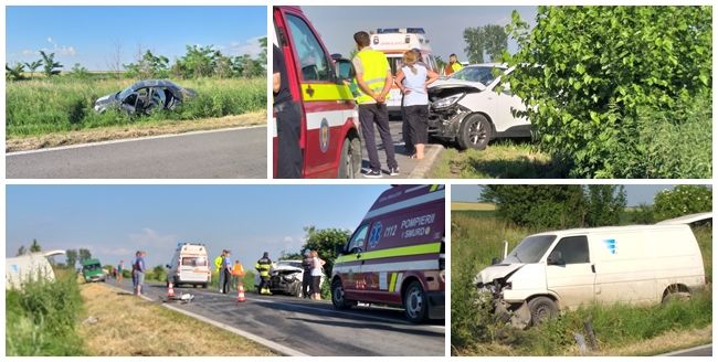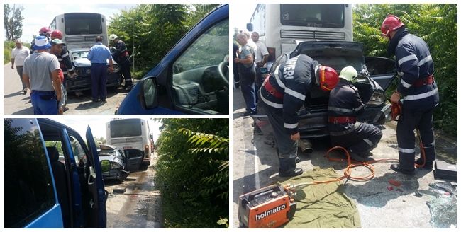 Patru persoane au fost rănite, luni, după ce un microbuz a luat foc din mers, iar șoferul acestuia s-a speriat și a ajuns pe contrasens, unde s-a izbit de un Hyundai. Șoferul unei Dacii care se afla în spatele autoturismului Hyundai a reușit să evite milimetric să intre în cele două mașini și a ajuns pe câmp.