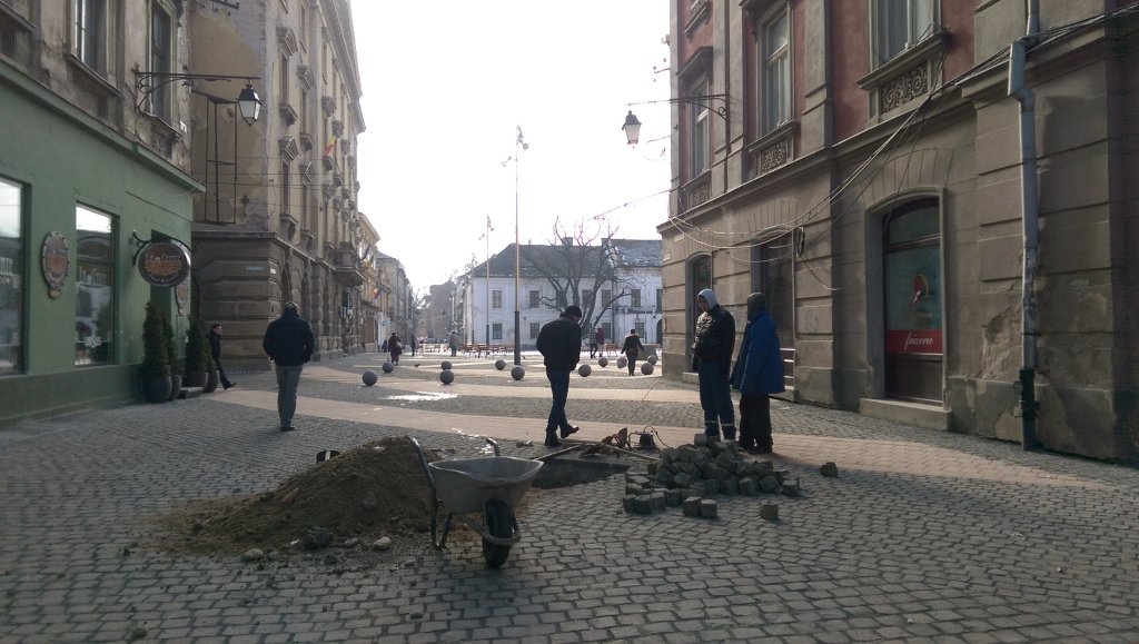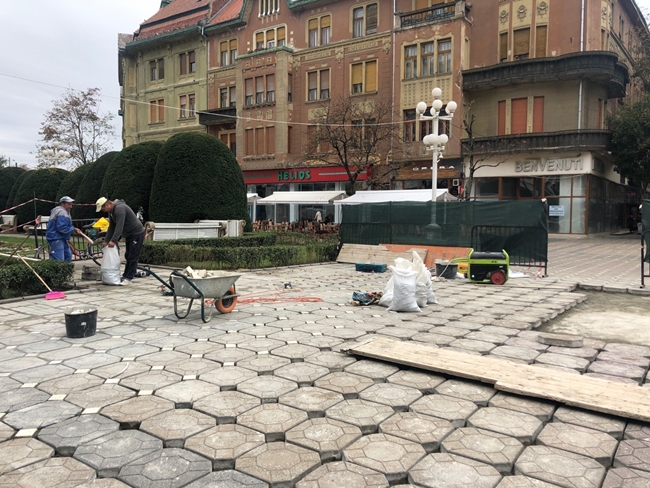 Lucrăm pe bucăți, deși avem proiect de reabilitare a Pieței Victoriei! Muncitorii Societății de Drumuri Municipale s-au apucat să scoată din pavajul din centrul orașului și să-l rearanjeze. E un test doar, iar dacă iese „mulțumitor”, atunci se lucrează pe front mai larg. Oricum nu e timp de reabilitarea completă a Pieței Victoriei.