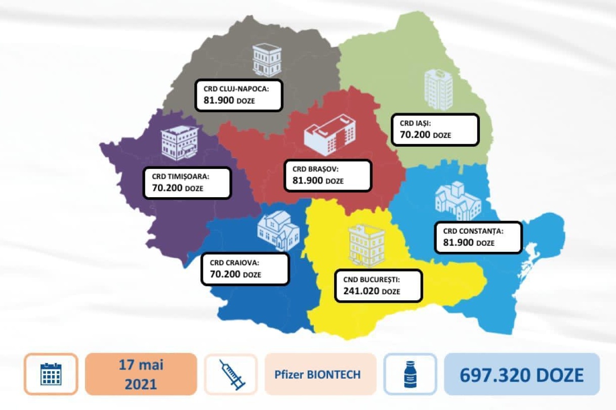 Cel mai nou transport de vaccin de la Pfizer aduce la Timișoara 70.200 de doze, la fel ca-n Iași și Craiova. La Cluj, Brașov și Constanța merg ceva mai multe doze, iar grosul se duce la București. România a recepționat în total 6,5 milioane de doze de vaccin de la Pfizer, din care 5,3 milioane au fost folosite deja.