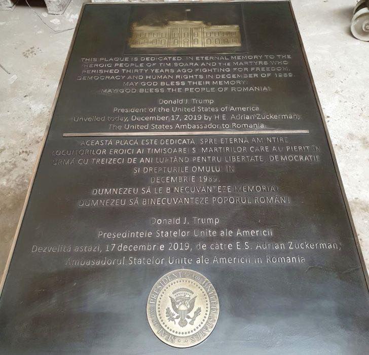 Până să avem un monument dedicat revoluției, cu ocazia aniversării a 30 de ani de la Revoluția din Decembrie 1989, Primăria Timișoara se laudă cu o placă memorială cu numele lui Donald Trump pe ea. Aceasta va fi amplasată pe clădirea garnizoanei din Piața Libertății, unde în câțiva ani va funcționa Muzeul Național al Revoluției Anticomuniste din Decembrie 1989.