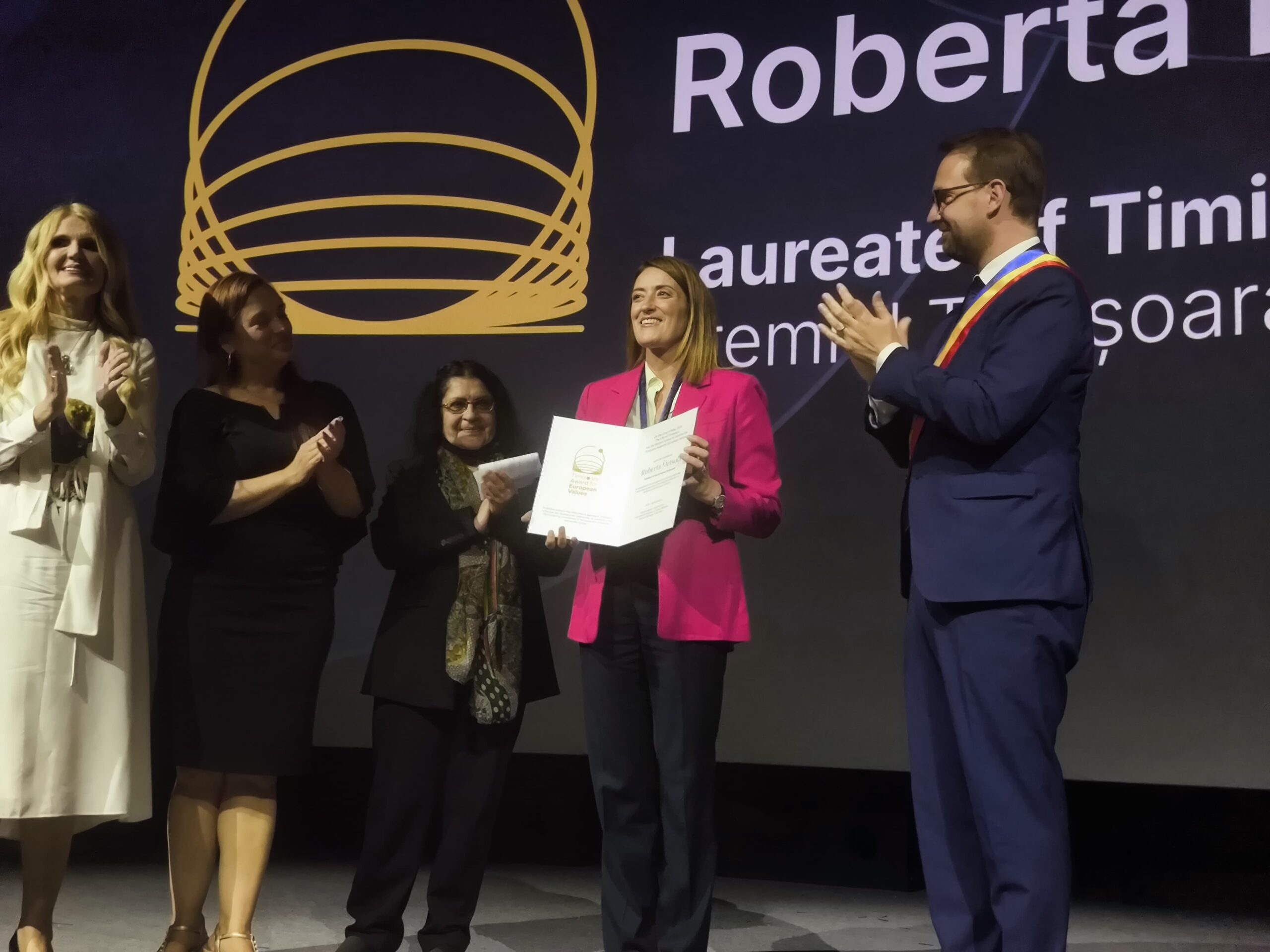 Joi, 22 mai, într-o ceremonie organizată la Cinema Timiș, Roberta Metsola a primit premiul „Timișoara pentru Valori Europene”. Cu o seară înainte, președinta Parlamentului European a avut o întrevedere cu președintele ales al României Nicușor Dan, iar în cursul dimineții zilei de joi s-a întâlnit cu sute de elevi și studenți timișoreni.