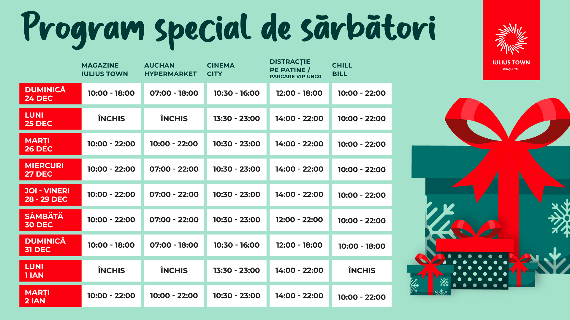 În perioada sărbătorilor de iarnă, fiecare dintre noi își dorește să petreacă cât mai mult timp cu familia, astfel că și Iulius Town Timișoara va avea un program special. Prima zi de Crăciun și 1 ianuarie 2024 sunt dedicate celor dragi, astfel că Iulius Mall și hipermarket-ul Auchan sunt închise, însă în Ajunul Crăciunului până la ora 18.00 încă mai poți să cumperi cadouri și delicatese pentru masa cu familia.
