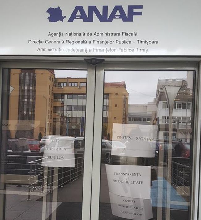 Într-o mișcare decisă în ultimul moment, menită să atragă atenția asupra situației existente în sistemul de Finanțe din România, care se confruntă cu eliminarea celor opt structuri regionale create în urmă cu câțiva ani, angajații Direcției Regionale Timișoara au protestat din nou în holul instituției. Acțiunea a avut loc chiar în timpul dezbaterilor care au avut loc în comisiile reunite ale Parlamentului, în care Timișoara a fost dată ca exemplu negativ la nivel național, cum că s-ar împotrivi schimbărilor din sistem.