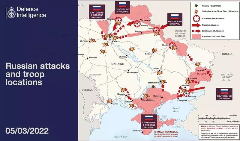 Ministerul Britanic al Apărării monitorizează situația din Ucraina. Cel puțin cinci orașe mari sunt înconjurate de armata Rusiei. Cel mai mare progres al acesteia este în sud, unde orașul Herson a fost capturat. Portul Mariupol a fost încercuit și blocat în totalitate. „Blocajul" Sumy din nord a fost depășit. Trupele rusești se îndreaptă cu repeziciune spre Kiev.