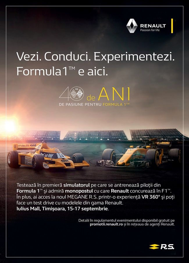 ADVERTORIAL. Testează în premieră simulatorul pe care se antrenează piloții din Formula 1 și admiră monopostul cu care Renault concurează în F1. În plus, ai acces la noul MEGANE R.S. printr-o experiență VR 360° și poți face un test drive cu modelele din gama Renault la Iulius Mall, Timișoara, în perioada 15-17 septembrie.