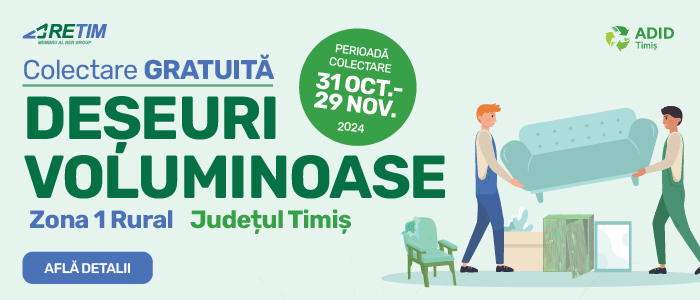 RETIM, în colaborare cu ADID Timiș, lansează o nouă campanie de colectare gratuită a deșeurilor voluminoase în Zona 1 Rural a județului Timiș, care se va desfășura în perioada 31 octombrie - 29 noiembrie 2024, în următoarele localități: Bucovăț, Parța, Variaș, Sânandrei, Săcălaz (și în Beregsău Mic și Beregsău Mare), Șandra, Iecea Mare, Mașloc (și în Alioș), Pișchia, Fibiș, Cărpiniș, Cenei, Checea, Foeni, Otelec (și în Iohanisfeld), Uivar, Dudeștii Noi, Becicherecu Mic, Satchinez (și în Hodoni și Bărăteaz), Biled, Giulvăz și Peciu Nou (și în Diniaș și Sânmartinul Sârbesc).
