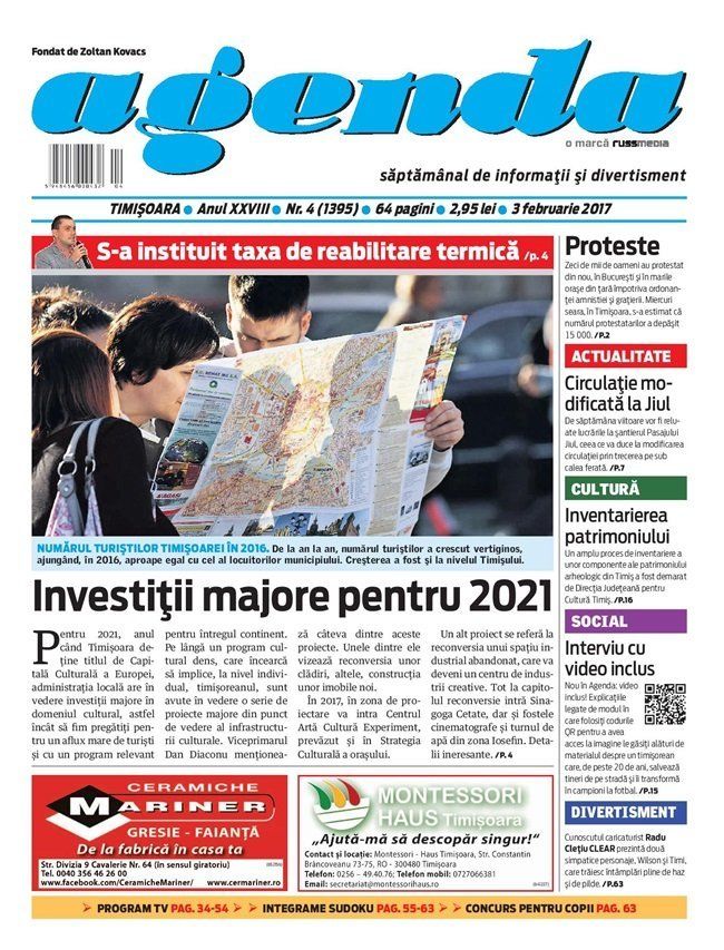 A venit momentul ca săptămânalul Agenda să se reinventeze. De azi, în fiecare zi de vineri a săptămânii, veți găsi la chioșcuri un ziar într-un format mai mic, dar întins pe 64 de pagini full color ce cuprind reportaje, analize, interviuri, divertisment, benzi desenate și program TV. De asemenea, săptămânalul Agenda devine azi primul ziar tipărit cu video inclus în paginile sale.