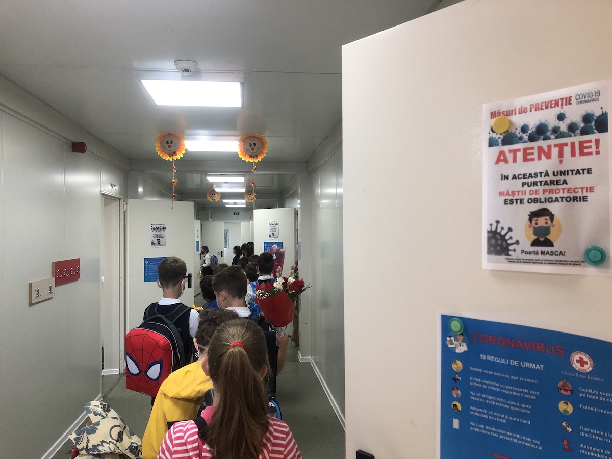 Aglomerație pe trotuarele de lângă Școala Gimnazială 30 din Soarelui. Zeci de părinți au mers să-și ducă copiii la școală. Obligați să stea cu măști pe față, micuții au mers în șir indian în spatele învățătoarelor, cu buchete de flori în mână. Cei mai mici au făcut „trenulețul” spre clasele pregătitoare, ținându-se de baloane puse în pungi și legate de ață la un metru distanță.