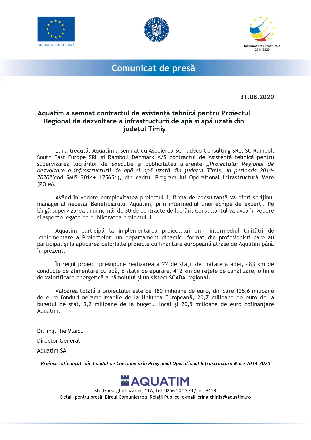 ADVERTORIAL. Luna trecută, Aquatim a semnat cu Asocierea SC Tadeco Consulting SRL, SC Ramboll South East Europe SRL și Ramboll Denmark A/S contractul de Asistență tehnică pentru supervizarea lucrărilor de execuție și publicitatea aferente „Proiectului Regional de dezvoltare a infrastructurii de apă și apă uzată din județul Timiș, în perioada 20142020”(cod SMIS 2014+ 125651), din cadrul Programului Operațional Infrastructură Mare (POIM).