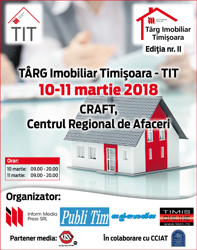Cele mai bune oferte pentru achiziţionarea unei noi locuinţe, dar şi pentru a vă finanţa visul de casă nouă le veţi găsi la ediția a doua a TIT – Târgul Imobiliar Timişoara, care are loc sâmbătă şi duminică, 10-11 martie 2018, la Centrul Regional de Afaceri. Desigur, intrarea este liberă, iar vizitatorii pot câştiga premii constând în abonamente la Spa, lenjerii de pat şi marele premiu, un weekend de vis la Budapesta.