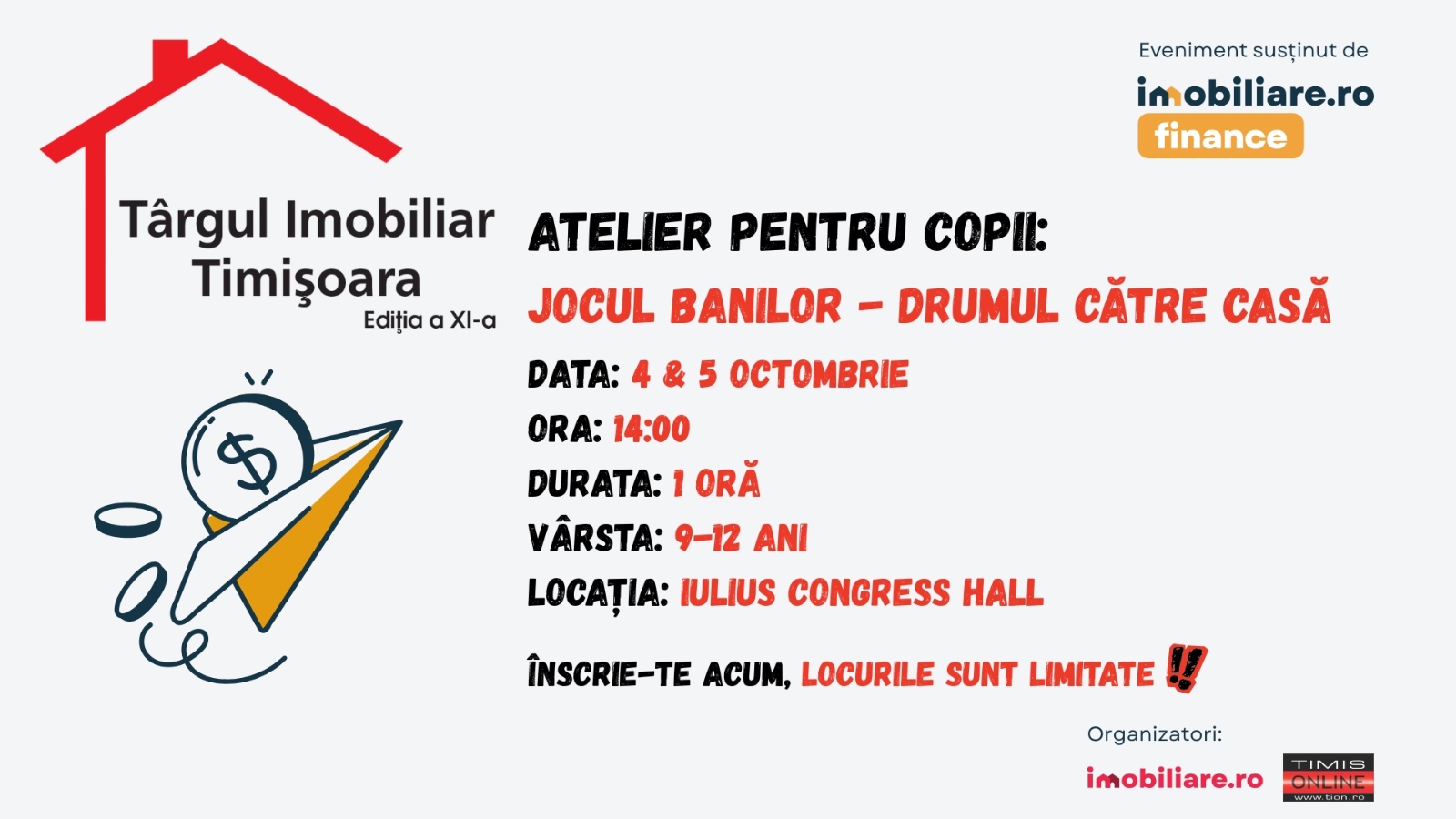 Cum pot copiii să învețe ce înseamnă economisirea și gestionarea banilor? Prin joacă! Atelierul interactiv „Jocul banilor – Drumul către casă”, dedicat copiilor cu vârste între 9 și 12 ani, îi provoacă pe cei mici să descopere, pas cu pas, cum să ia decizii financiare optime în viața de zi cu zi – de la plata cheltuielilor curente până la economii pentru un obiectiv mare. Evenimentul are loc în cadrul ediției de toamnă a Târgului Imobiliar Timișoara.