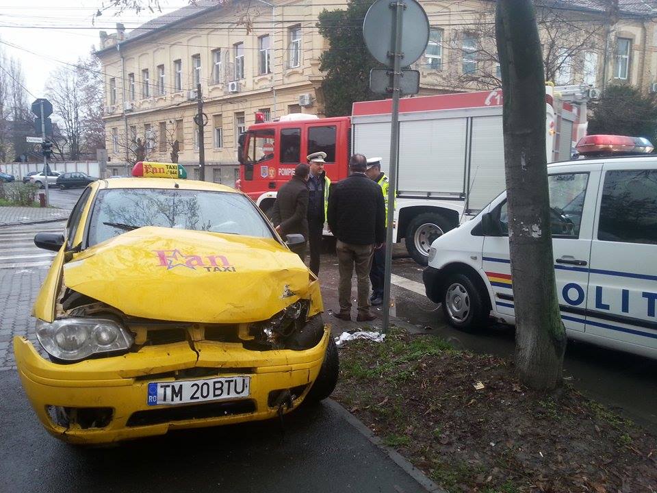 Un taximetrist s-a răsturnat cu mașina într-o intersecție din Timișoara, cu pasageri cu tot, după ce s-a ciocnit de o dubiță. Cele trei persoane aflate în autoturism au fost rănite și au ajuns la spital.