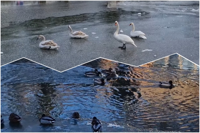 Luni dimineață, pe Bega, parțial înghețată din cauza temperaturilor scăzute din ultimele zile, un cititor Tion.ro a surprins o scenă inedită pentru Timișoara: patru lebede albe stând pe gheață, în zona Flora – Catedrala Mitropolitană.