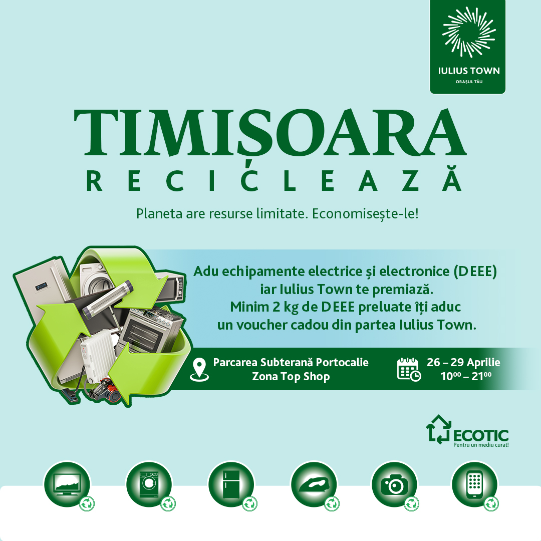 ADVERTORIAL. Schimbarea începe cu un gest mic pe care fiecare dintre noi îl poate face. Acțiunea „Timișoara reciclează” face parte din strategia de sustenabilitate a companiei IULIUS, care își continuă preocuparea pentru conservarea mediului înconjurător. Dacă ai acasă un radio care nu mai funcționează, un televizor stricat, un fier de călcat pe care nu îl mai folosești sau orice alt deșeu electric ori electronic, vino în Iulius Town, reciclează responsabil, iar noi te recompensăm!