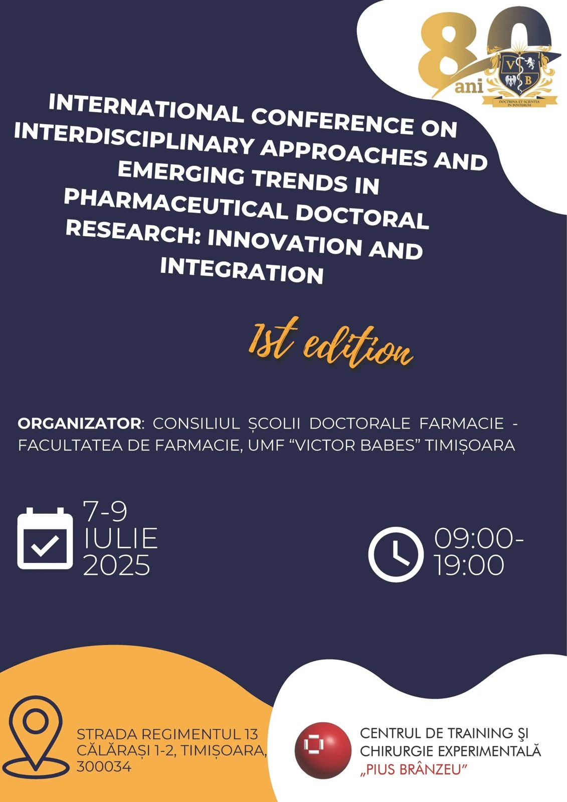 În perioada 7–9 iulie 2025, la Timișoara, se desfășoară prima ediție a Conferinței Internaționale privind Abordările Interdisciplinare și Tendințele Emergente în Cercetarea Doctorală Farmaceutică: Inovație și Integrare, un eveniment de amploare organizat de Consiliul Școlii Doctorale Farmacie din cadrul Facultății de Farmacie a Universității de Medicină și Farmacie „Victor Babeș” Timișoara.