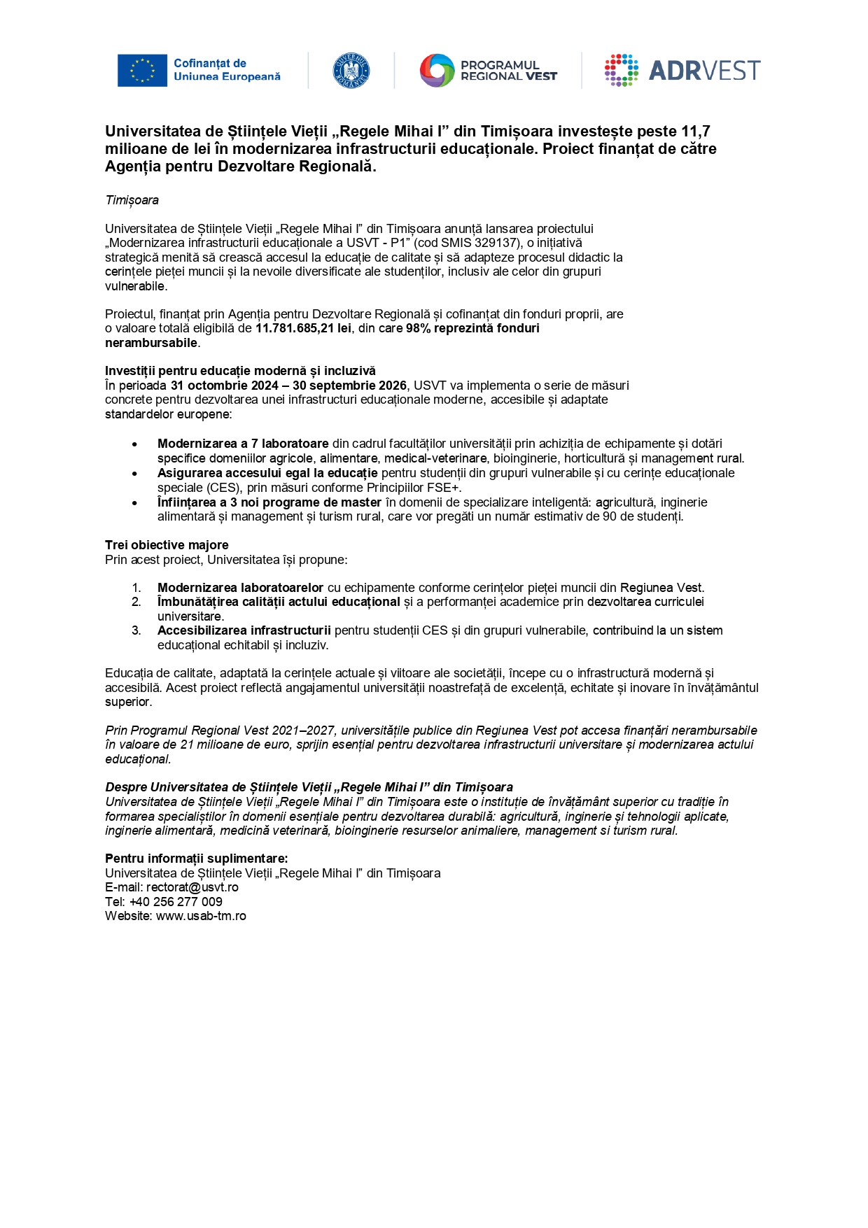 Universitatea de Științele Vieții „Regele Mihai I” din Timișoara anunță lansarea proiectului „Modernizarea infrastructurii educaționale a USVT - P1” (cod SMIS 329137), o inițiativă strategică menită să crească accesul la educație de calitate și să adapteze procesul didactic la cerințele pieței muncii și la nevoile diversificate ale studenților, inclusiv ale celor din grupuri vulnerabile.