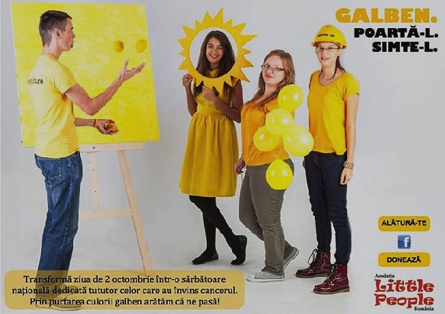 Lupta cu cancerul este foarte grea. Vestea acestei boli grele și lupta cu ea te marchează pe viață, iar, uneori, din păcate, boala învinge. Dar oamenii luptă și de multe ori biruie. În 2 octombrie îi puteți susține pe cei care luptă cu cancerul purtând o bandană galbenă sau chiar și un tricou sau orice obiect de îmbrăcăminte de culoarea soarelui.