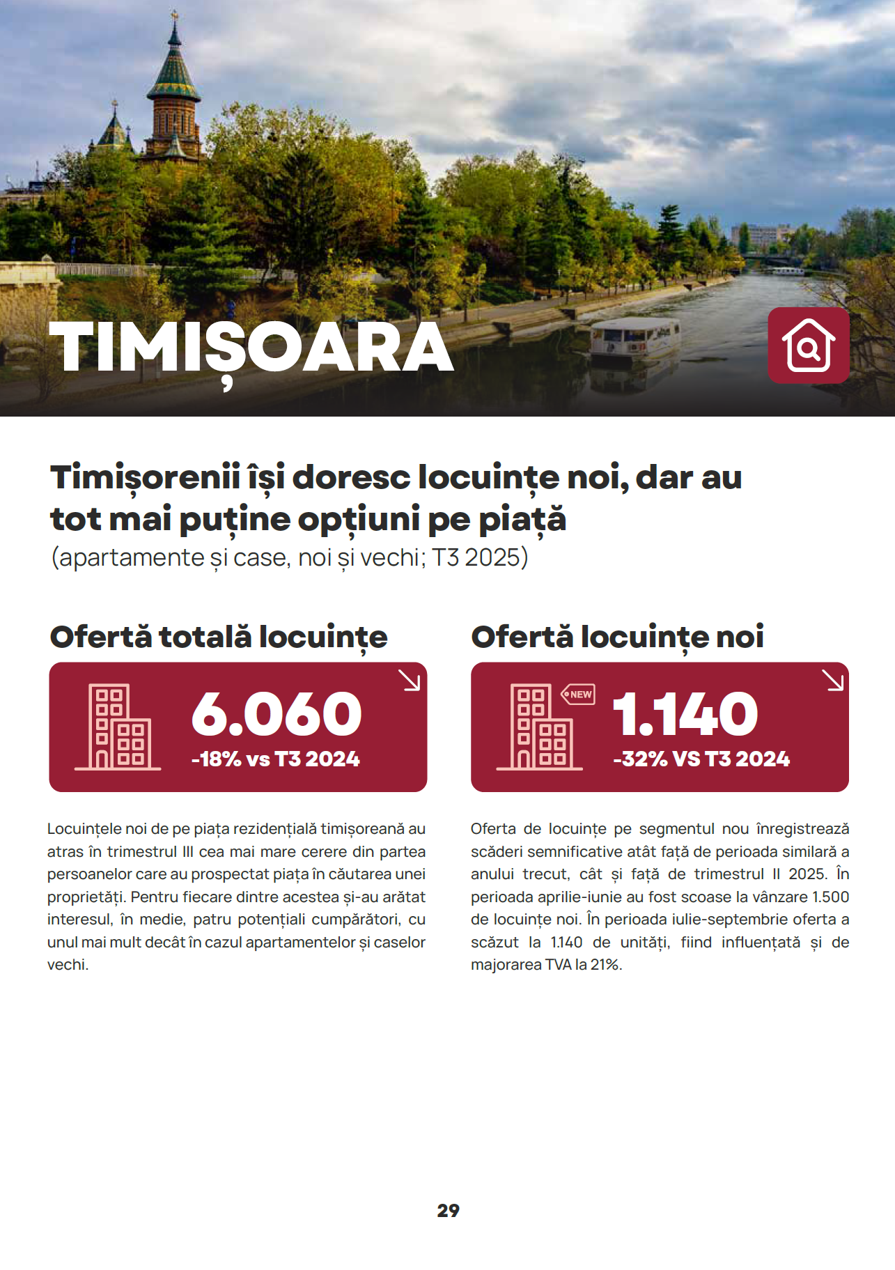 Din raportul detaliat, mai putem afla că oferta locuințelor a scăzut cu 18% față de trimestrul III de anul trecut, fiind 6.060 de locuințe listate pe platformă. Dintre acestea, doar 1.140 sunt noi. Timișoara este al patrulea cel mai scump oraș din țară, cu o medie de 1.845 euro/mp util, fiind înregistrată o creștere de 11% în ultimele 12 luni.