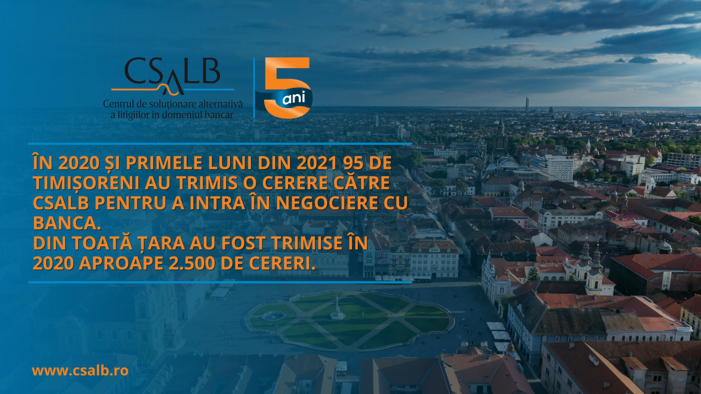 Anul trecut aproape 2.500 de români s-au adresat Centrului de Soluționare Alternativă a Litigiilor în domeniul Bancar (CSALB). 95 de consumatori din Timiș au solicitat în 2020 și primele luni din 2021 o negociere cu banca sau IFN-ul pentru contractele aflate în derulare, județul Timiș fiind în primele zece din țară ca număr de cereri transmise către CSALB.