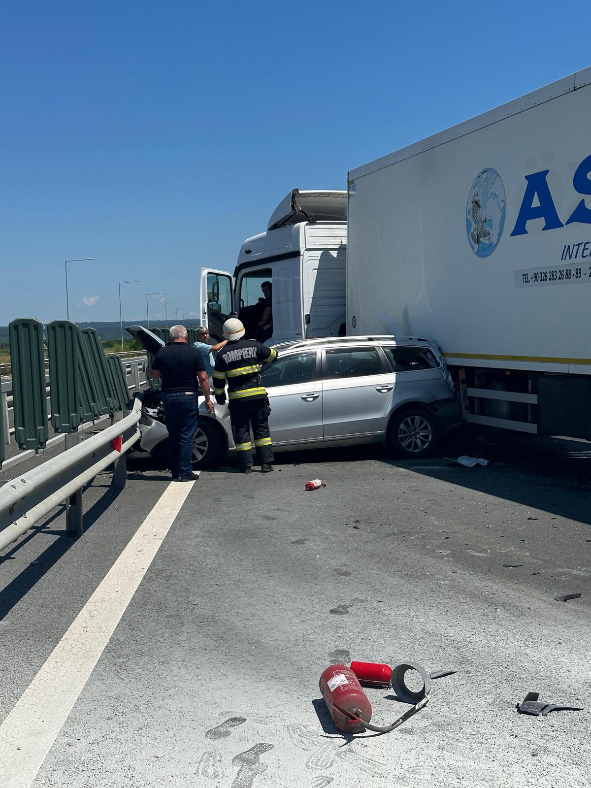 Accidentul s-a produs duminică în jurul orei 13 pe A1, sensul de mers spre Deva, la coborârea din zona localității timișene Margina. Traficul era foarte aglomerat în zonă, iar la un moment dat patru autoturisme și un tir s-au ciocnit.