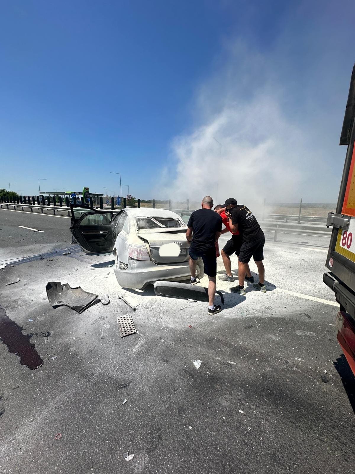 „La ora 13:11 am fost solicitați să intervenim pentru asigurarea măsurilor PSI și de prim-ajutor în urma unui accident rutier produs pe A1 km 428 (ieșire la Margina).