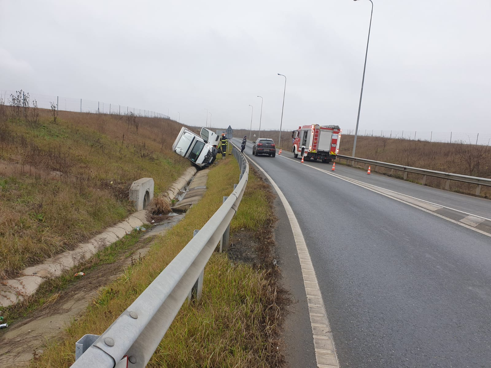 Accidentul s-a produs în jurul orei 10.30. La volanul autovehicului se afla un cetățean turc. A fost nevoie de intervenția pompierilor, după ce a ieșit de pe carosabil și s-a oprit în șanțul de pe marginea drumului.