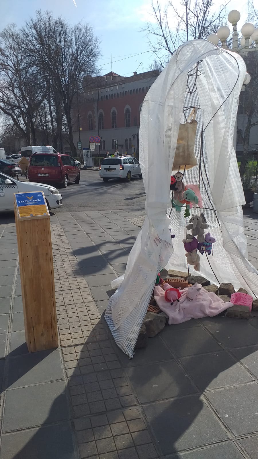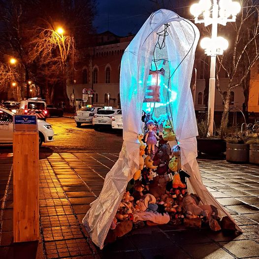 Instalația era plină de plușuri și jucării, multe dintre ele fiind donate chiar de copiii despre care „vorbește”. Duminică, instalația a rămas în picioare, însă fără acele jucării, care, se pare, au fost furate.