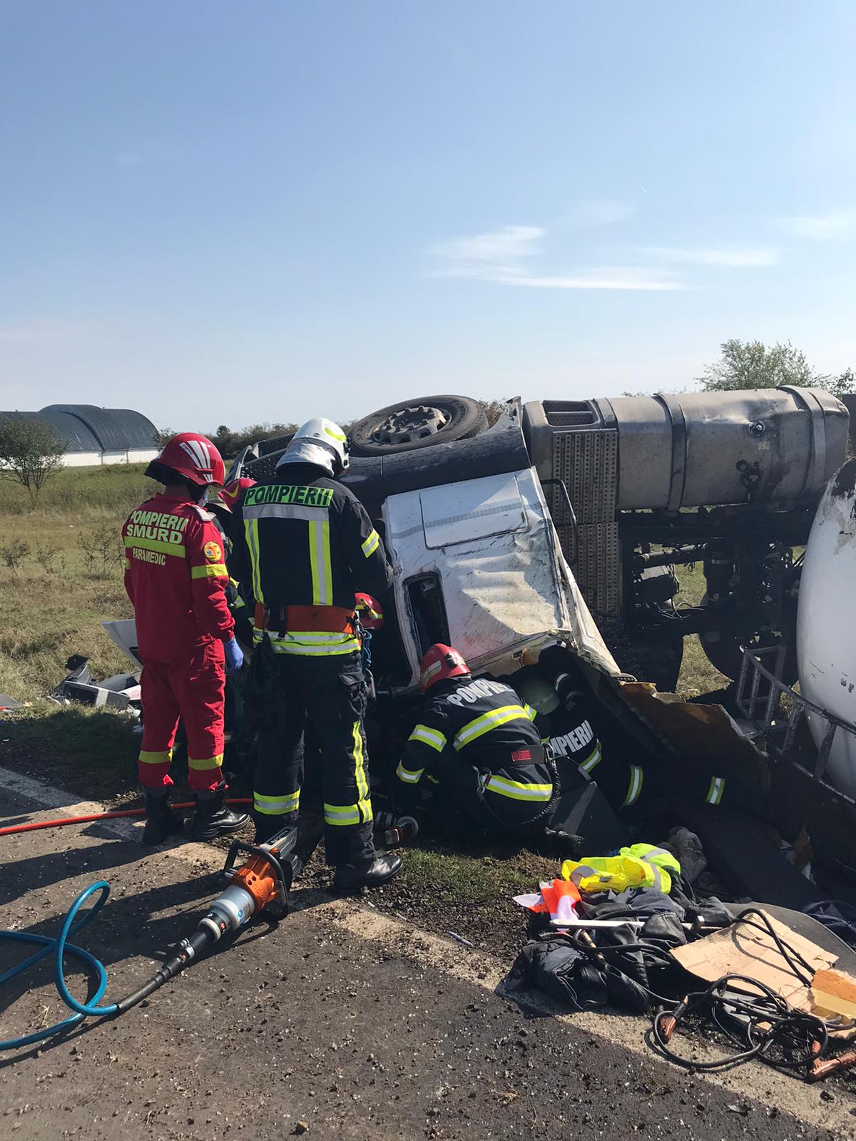 Șoferul a fost scos din cabină de către echipajul de descarcerare, la aproximativ o oră de la producerea accidentului. Este conștient și a fost transportat de urgență la spital.