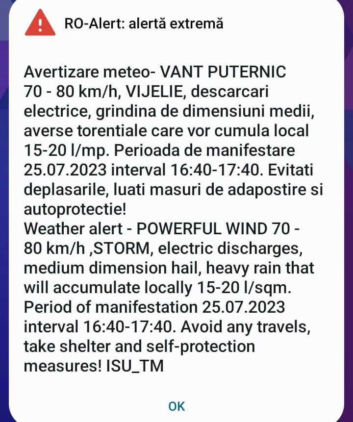Cei de la Administrația Națională de Meteorologie (ANM) au emis o avertizare de tip Cod Portocaliu de vreme rea, valabilă marți, 25 iulie, în intervalul orar 16:40 – 17:30.