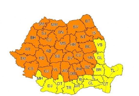 Codul portocaliu intră în vigoare miercuri, de la ora 12, și este valabil până la ora 23.