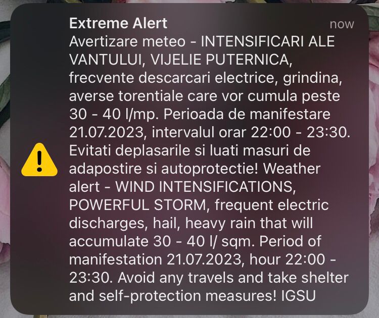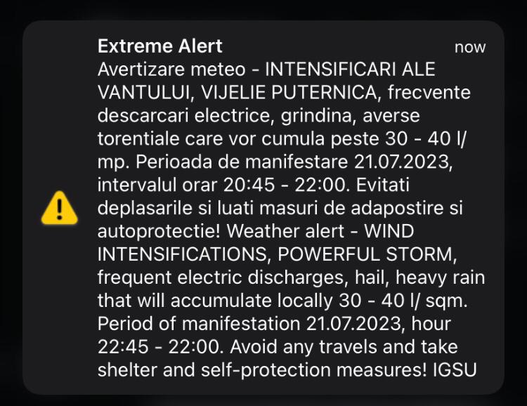 Un nou mesaj de avertizare a fost transmis de IGSU cetățenilor prin sistemul Ro-Alert. Codul se prelungește până la ora 23:30.