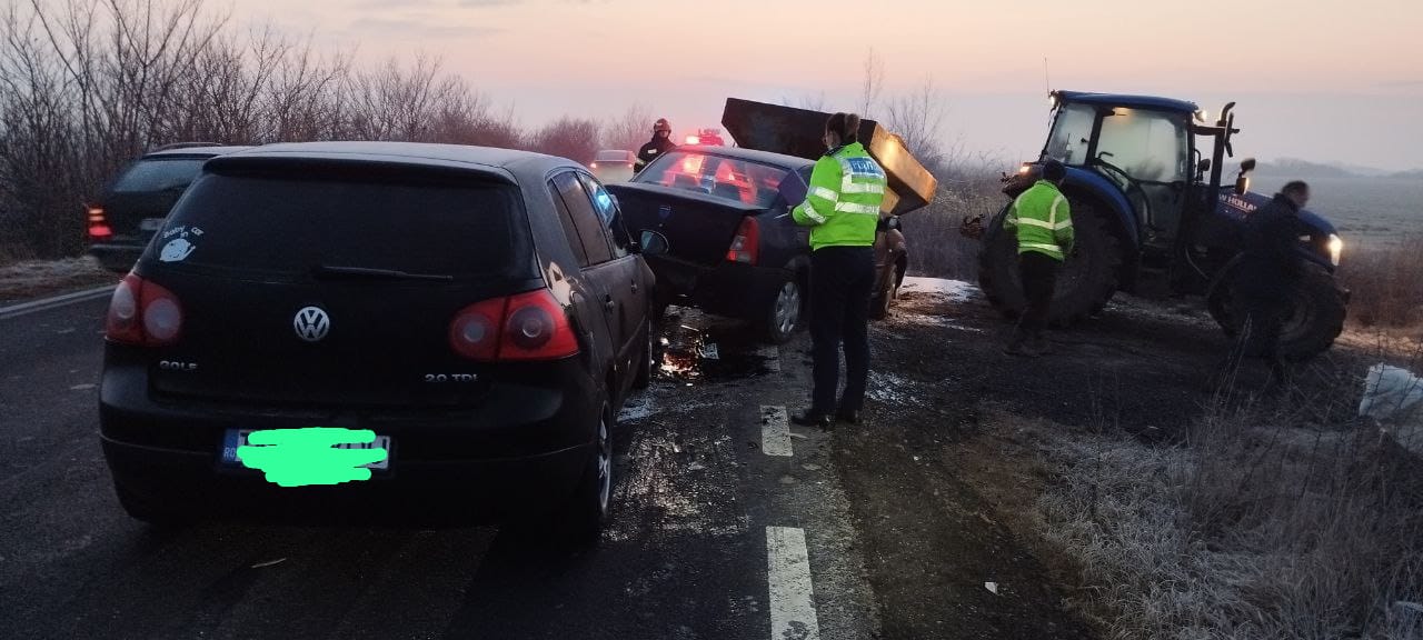 Accidentul s-a produs vineri dimineață pe DN59A, între Beregsău Mare și Săcălaz. Un bărbat în vârstă de 66 de ani circula spre Săcălaz, iar la un moment dat nu a păstrat distanța regulamentară în trafic și a lovit din spate un tractor care circula în fața sa. Ulterior, mașina a fost lovită de un alt autoturism care se deplasa în aceeași direcție.