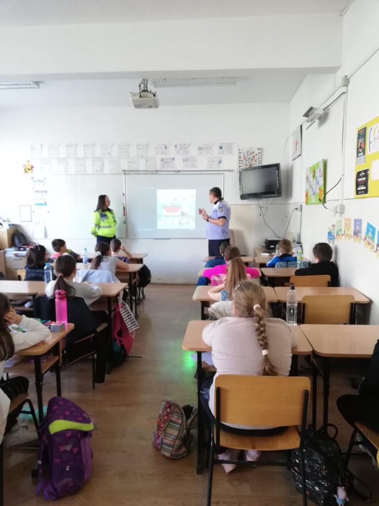 Polițiștii de la rutieră i-au vizitat joi pe elevii de la Școala Generală nr. 7 din Timișoara. Oamenii legii s-au întâlnit cu cei mici între orele 9:30 și 12:30 și au discutat cu ei despre legislația rutieră. La activități au participat 50 de elevi.
