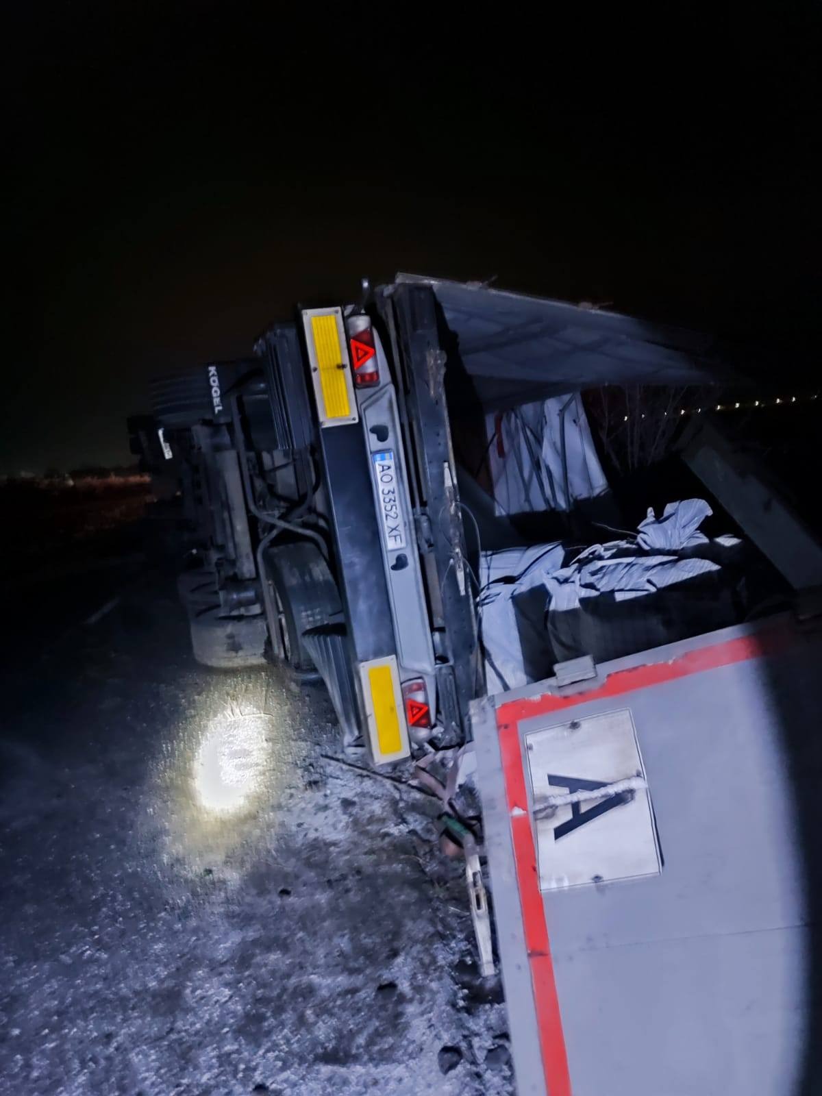 Un TIR a derapat şi s-a răsturnat pe carosabil între localităţile Grabaţ si Jimbolia, miercuri seara. Din primele informații furnizate de poliție reiese că TIR-ul este încărcat cu ipsos și prezintă scurgeri de motorină. Șoferul este cetățean străin și are 22 de ani.