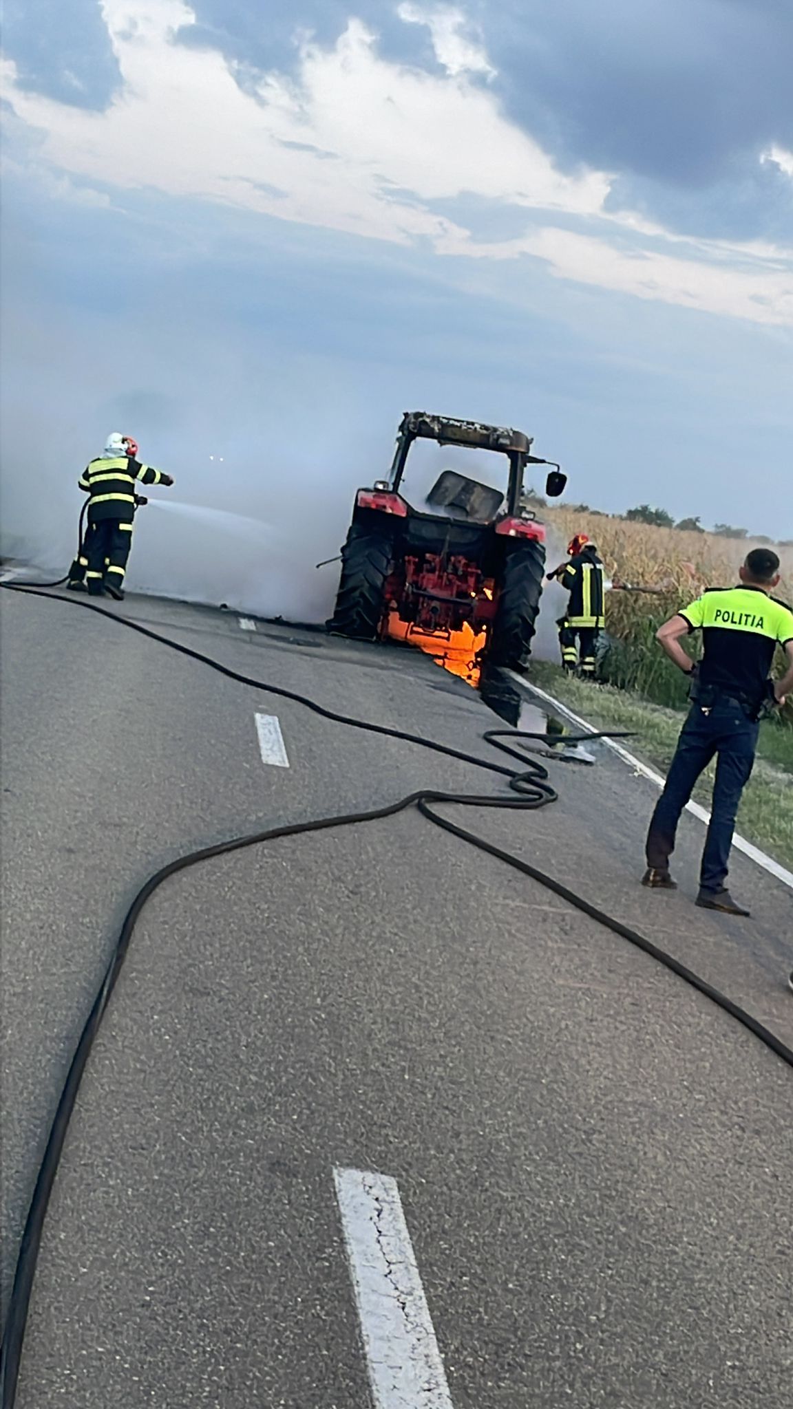 „Astăzi, 14.09.2023, la ora 19.34, am fost solicitați să intervenim pentru stingerea unui incendiu produs la un tractor, între localitățile Gottlob și Grabaț. Tractorul se afla în mers.